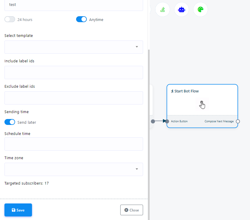 10. Finally, save the bot flow by clicking on the “Save” button on the Visual Flow Builder. The campaign will be created right after hitting the `Save` button.