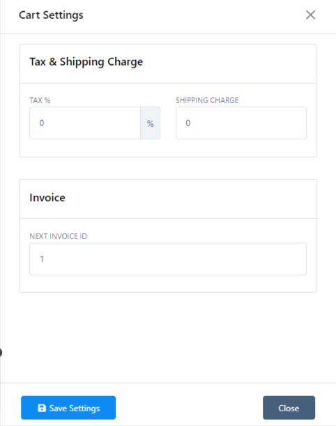 - Configure cart settings, including tax percentage and shipping charges.